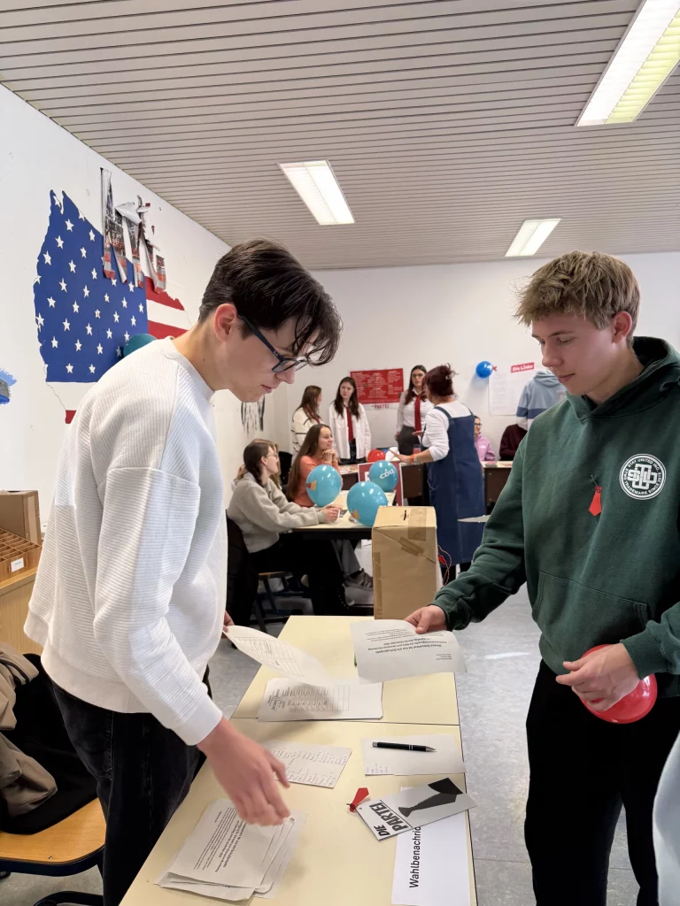 Für das leibliche Wohl sorgte an diesem Tag die AG Schule ohne Rassismus – Schule mit Courage. Neben Kaffee, Crêpes, Kinderpunsch und Pommes informierten die Schülerinnen und Schüler darüber, wofür die Einnahmen später genutzt werden: unter anderem für Exkursionen der gesamten E-Phase in Synagoge und Moschee. „Dass politische Bildung hier so ernst genommen wird, finde ich überzeugend“, sagte eine Mutter. Passend dazu konnten Besucher an einer Schülerwahl teilnehmen – inklusive Wahlkabine und Stimmzettel. Politische Bildung zum Anfassen.