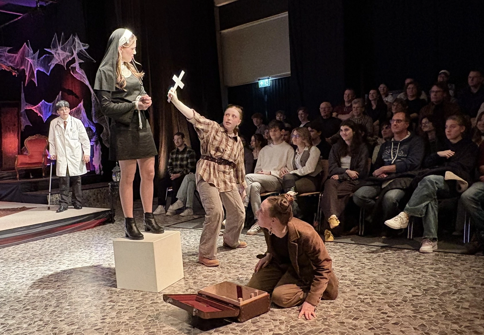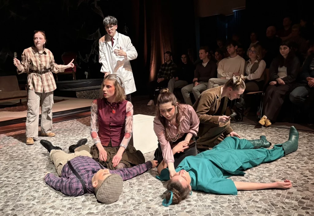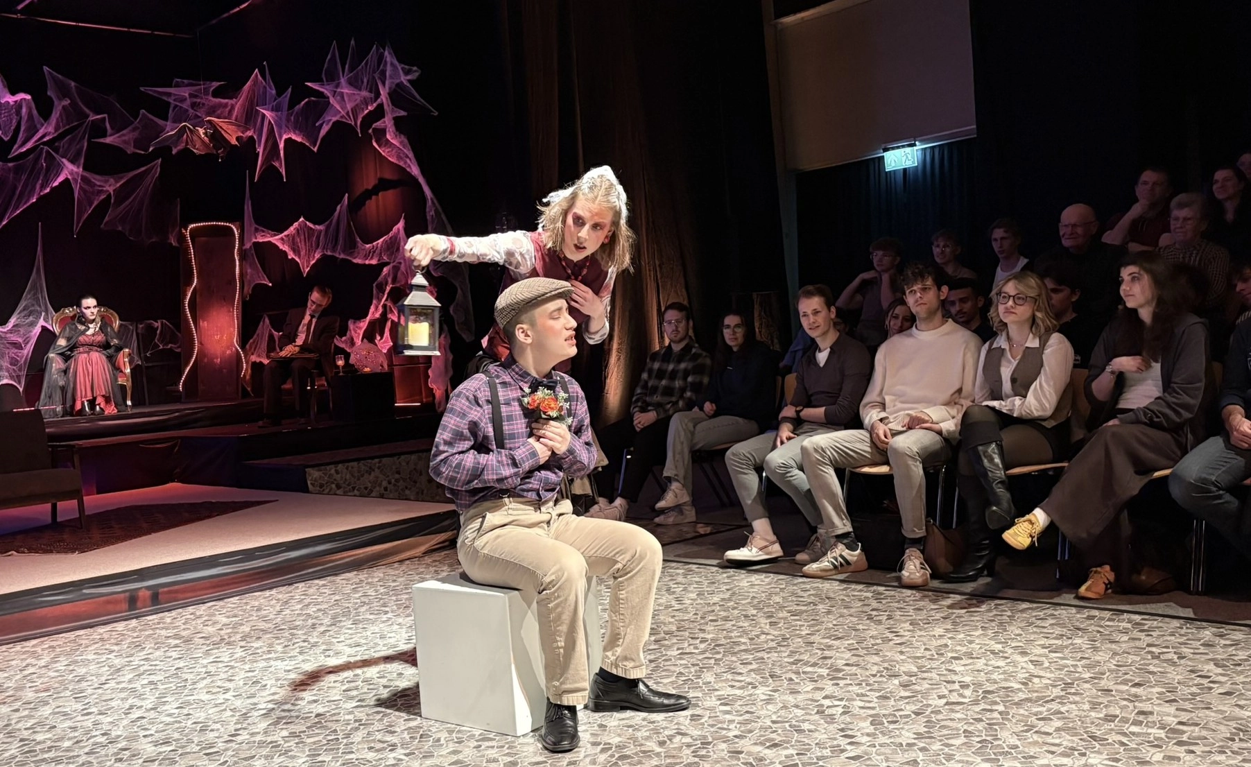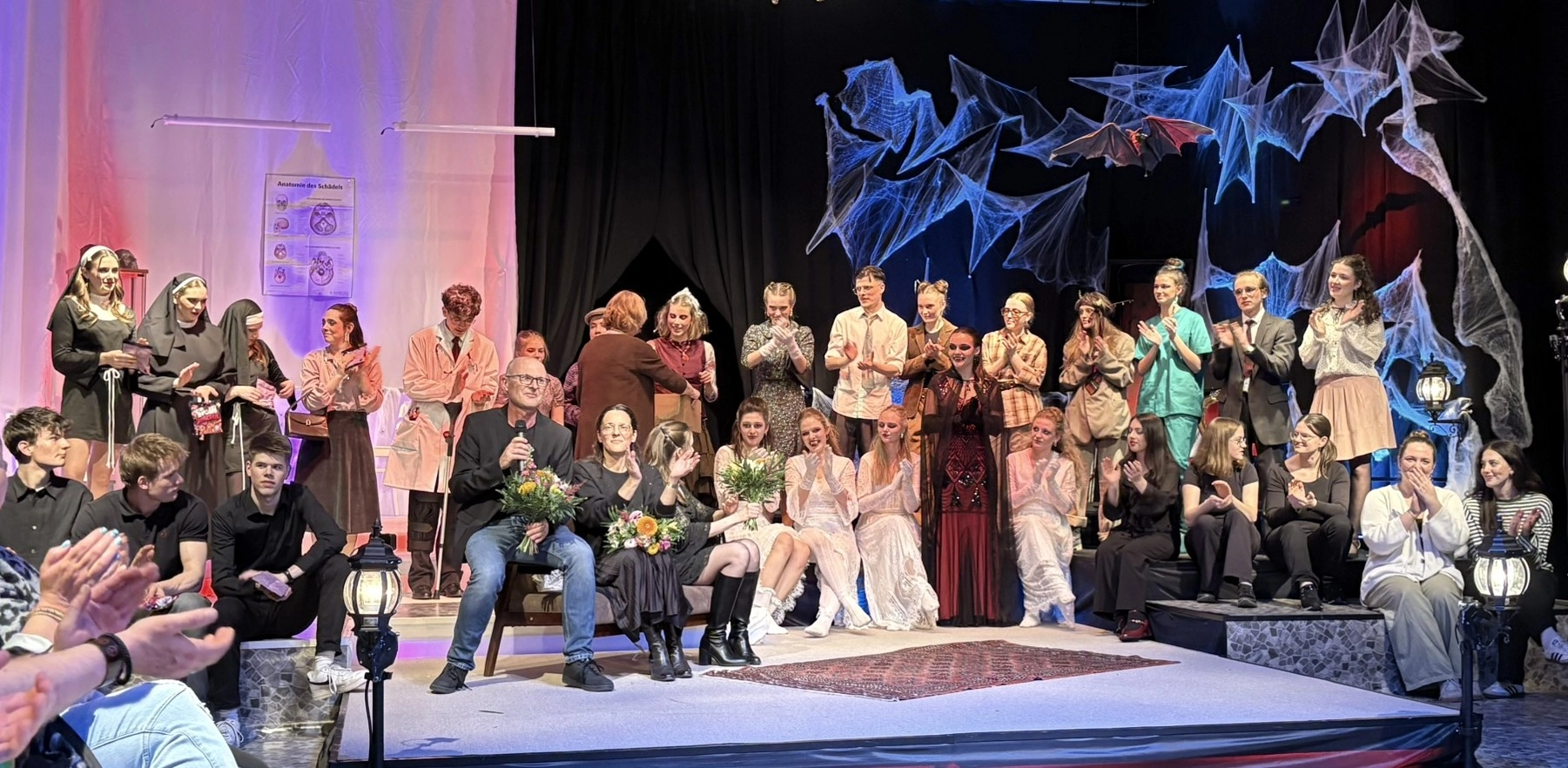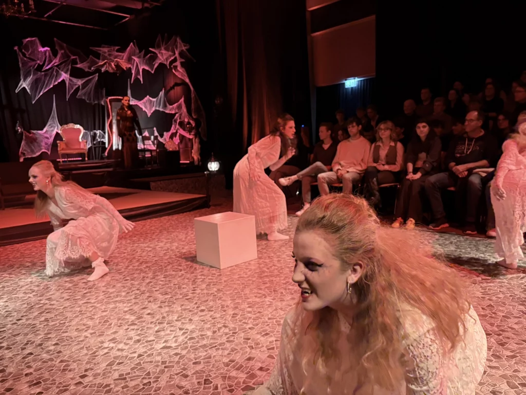Die „Bübis“ (unsere Bühnenbild-AG) sowie zahlreiche Helferinnen und Helfer haben beeindruckende Arbeit geleistet. Schon vor Beginn des Stücks zog das Bühnenbild die Aufmerksamkeit des Publikums auf sich: Draculas Schloss erscheint in düsteren Rot- und Schwarztönen, während die grell ausgeleuchtete Nervenanstalt in Neonröhren erstrahlt – ein eindrucksvoller Kontrast zwischen Fantasie und klinischer Realität. Auch Kostüme und Maske überzeugen, gestaltet von Lena Till und Sude Kablan, ehemaligen Schülerinnen, die dem Schultheater weiterhin verbunden sind. Die Tanzeinlagen wurden ebenfalls von einer ehemaligen Schülerin, Carolin Gehring, einstudiert – ein schönes Beispiel für „einmal Schultheater – immer Schultheater“.