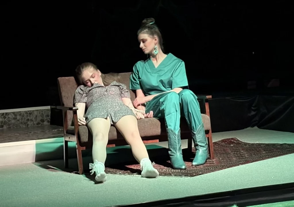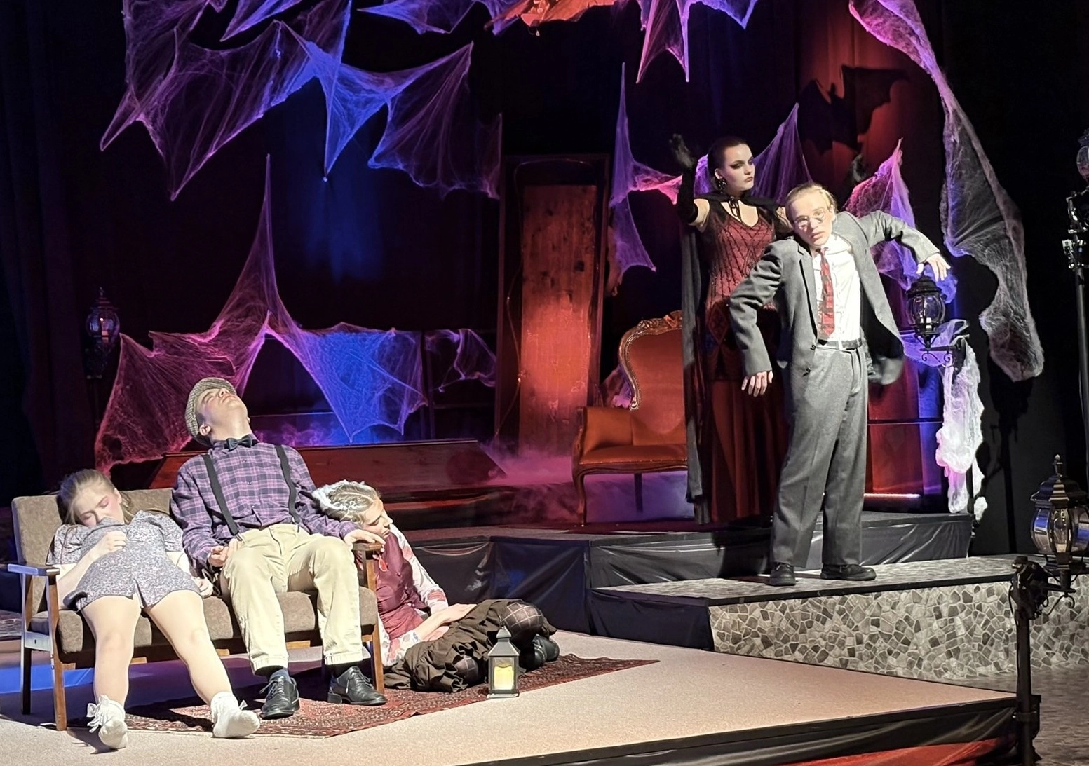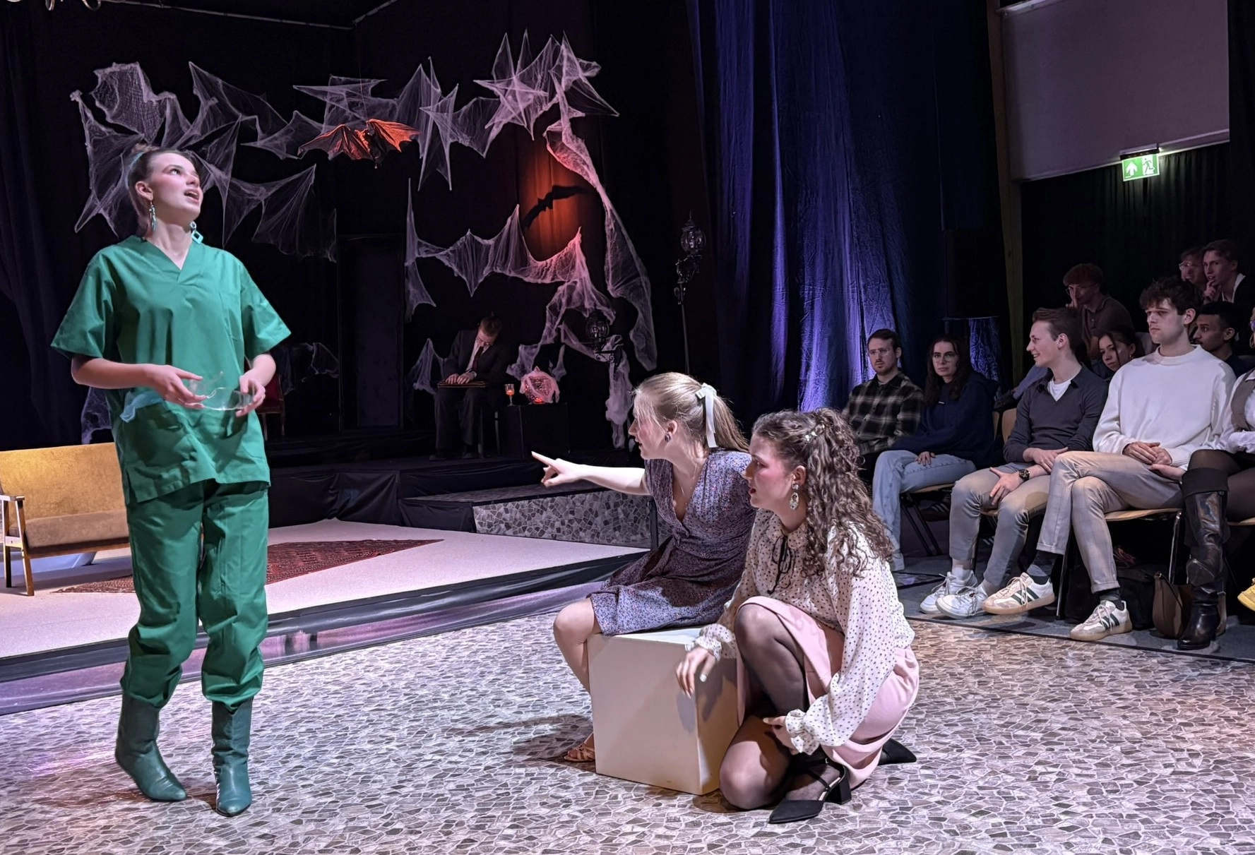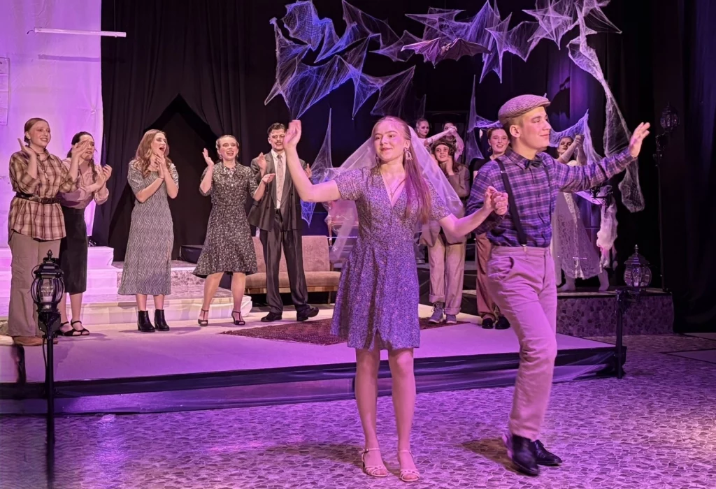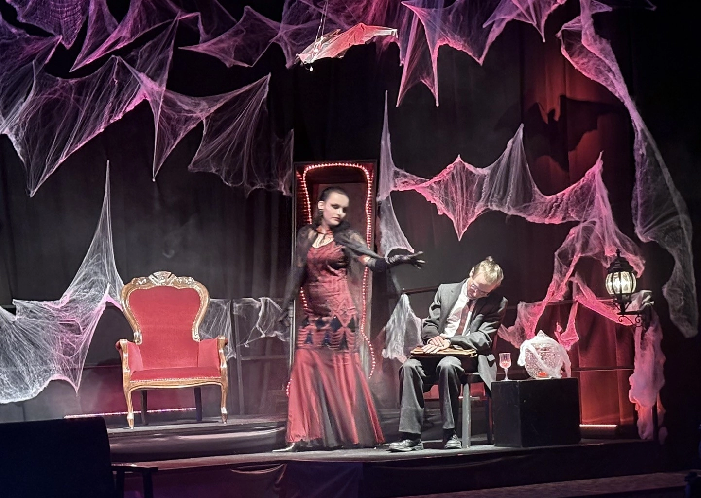 Die „Bübis“ (unsere Bühnenbild-AG) sowie zahlreiche Helferinnen und Helfer haben beeindruckende Arbeit geleistet. Schon vor Beginn des Stücks zog das Bühnenbild die Aufmerksamkeit des Publikums auf sich: Draculas Schloss erscheint in düsteren Rot- und Schwarztönen, während die grell ausgeleuchtete Nervenanstalt in Neonröhren erstrahlt – ein eindrucksvoller Kontrast zwischen Fantasie und klinischer Realität. Auch Kostüme und Maske überzeugen, gestaltet von Lena Till und Sude Kablan, ehemaligen Schülerinnen, die dem Schultheater weiterhin verbunden sind. Die Tanzeinlagen wurden ebenfalls von einer ehemaligen Schülerin, Carolin Gehring, einstudiert – ein schönes Beispiel für „einmal Schultheater – immer Schultheater“.