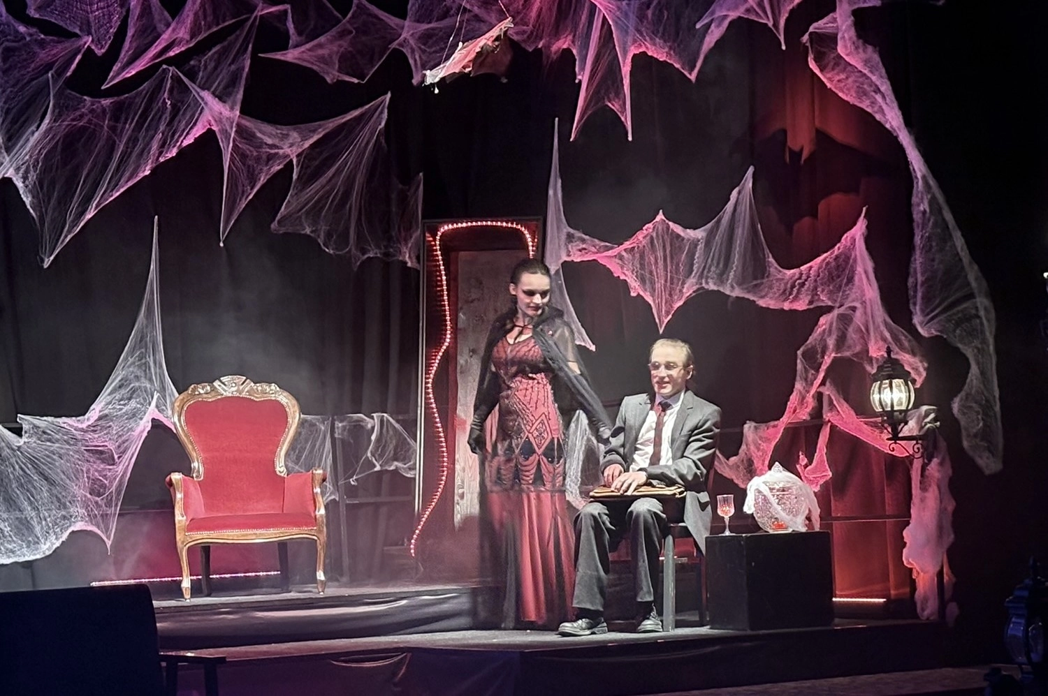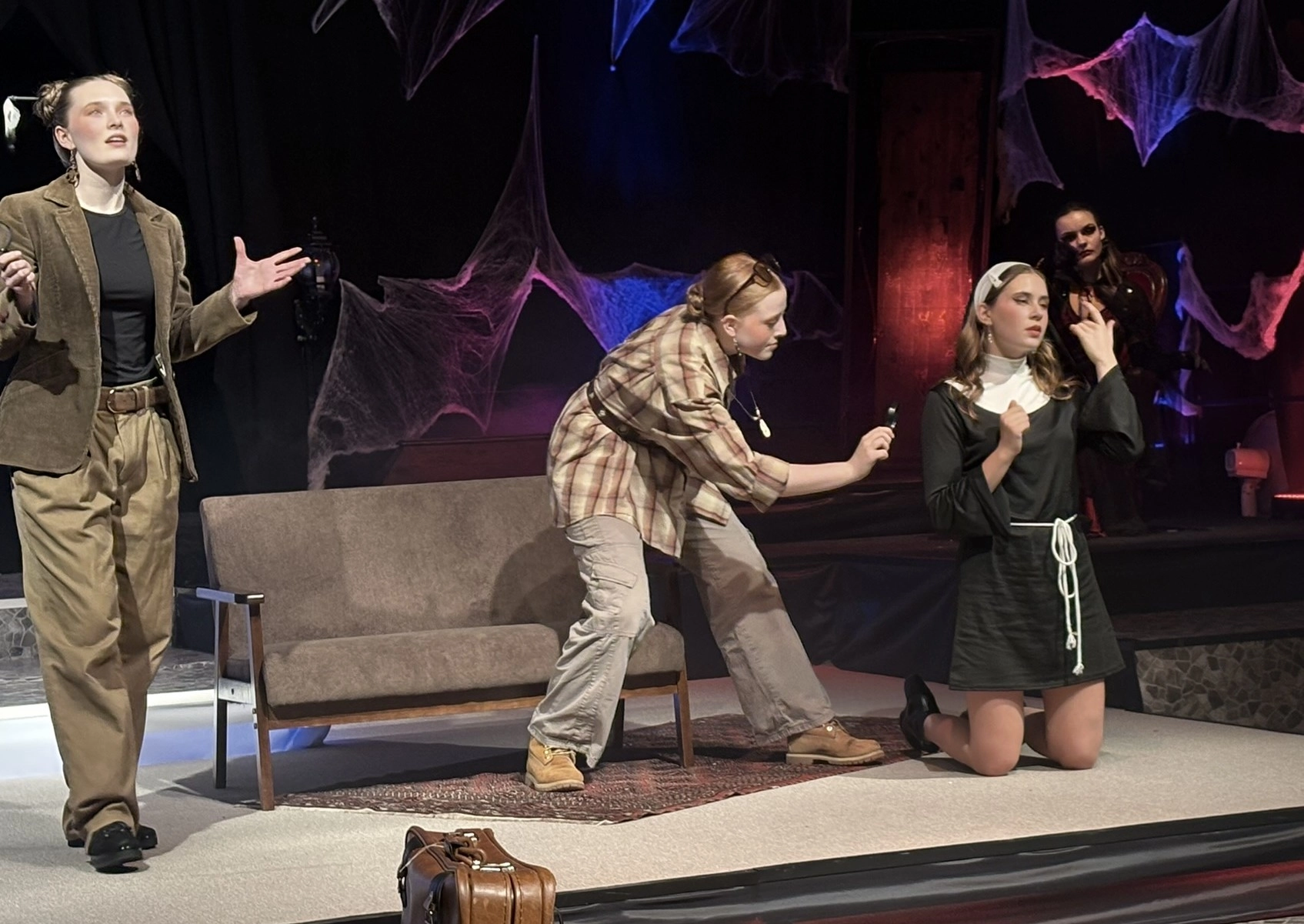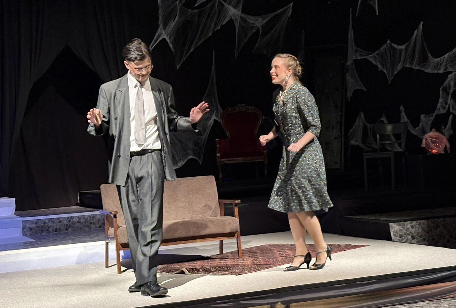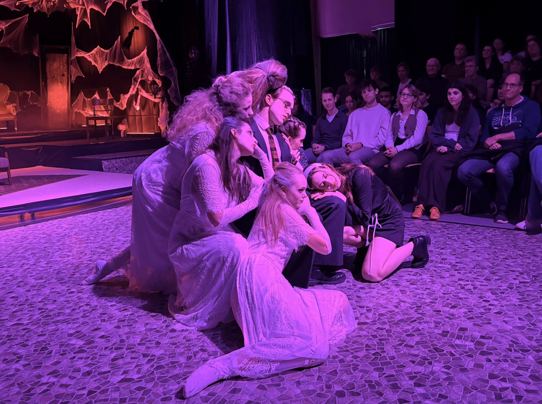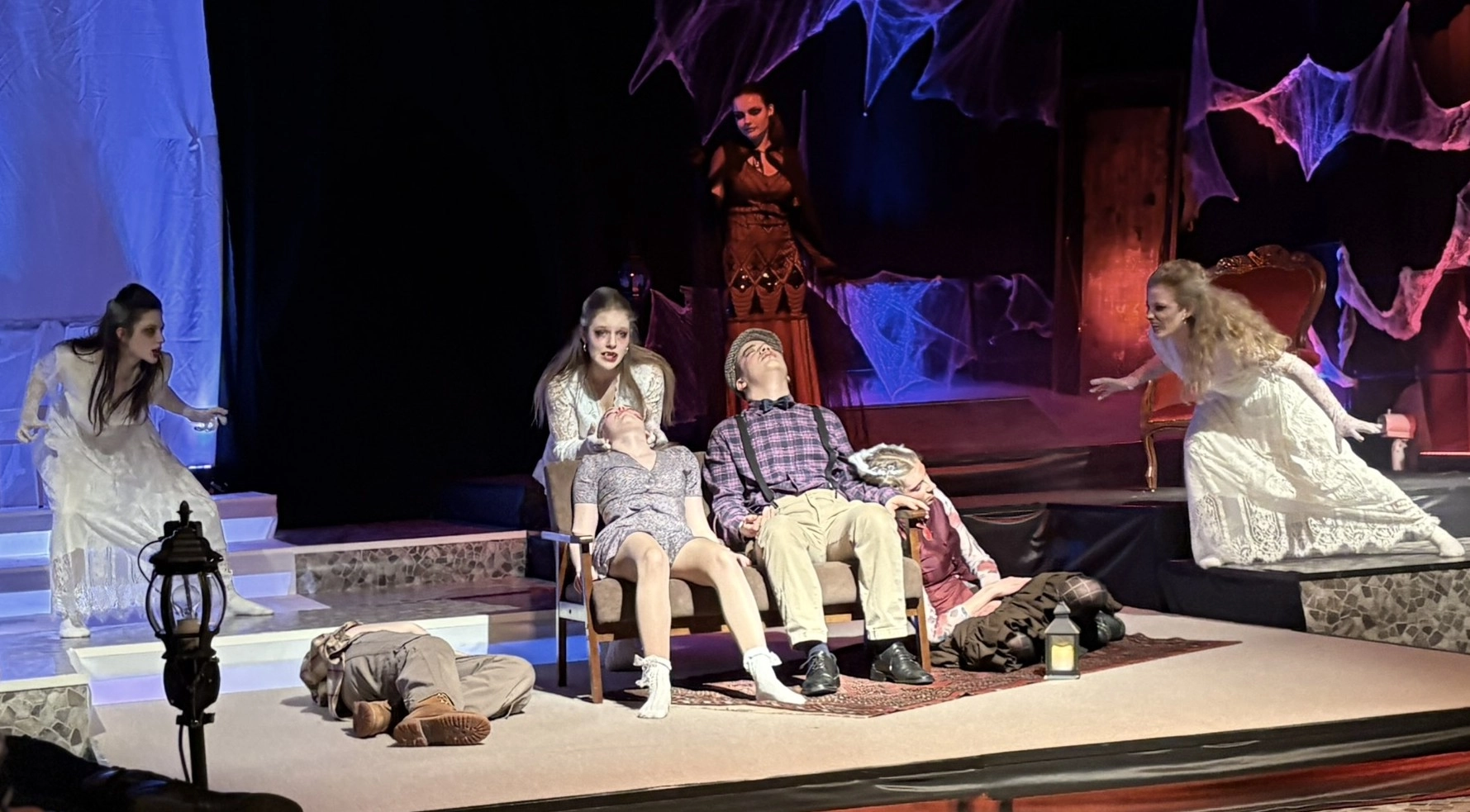 Die „Bübis“ (unsere Bühnenbild-AG) sowie zahlreiche Helferinnen und Helfer haben beeindruckende Arbeit geleistet. Schon vor Beginn des Stücks zog das Bühnenbild die Aufmerksamkeit des Publikums auf sich: Draculas Schloss erscheint in düsteren Rot- und Schwarztönen, während die grell ausgeleuchtete Nervenanstalt in Neonröhren erstrahlt – ein eindrucksvoller Kontrast zwischen Fantasie und klinischer Realität. Auch Kostüme und Maske überzeugen, gestaltet von Lena Till und Sude Kablan, ehemaligen Schülerinnen, die dem Schultheater weiterhin verbunden sind. Die Tanzeinlagen wurden ebenfalls von einer ehemaligen Schülerin, Carolin Gehring, einstudiert – ein schönes Beispiel für „einmal Schultheater – immer Schultheater“.