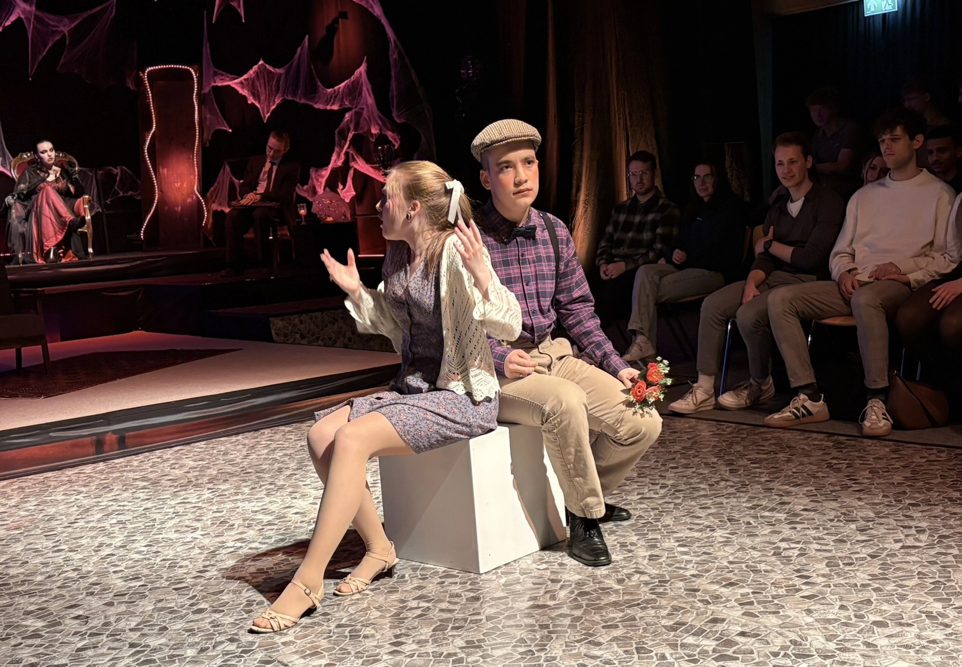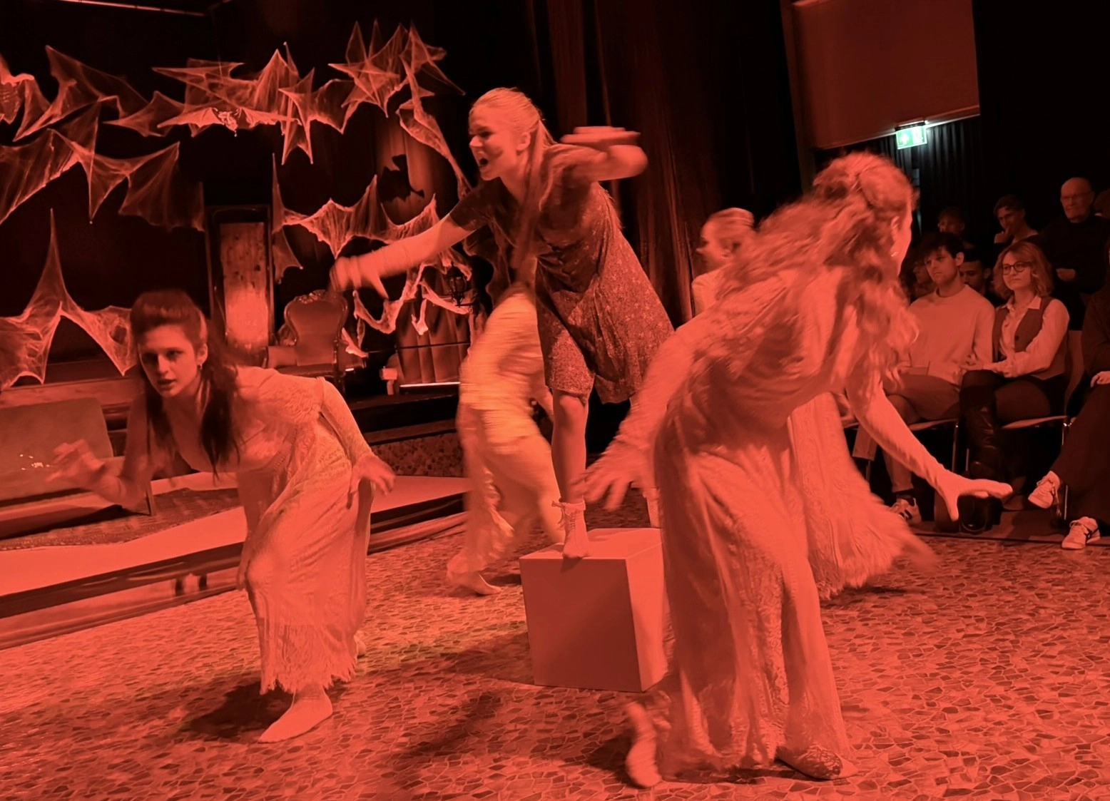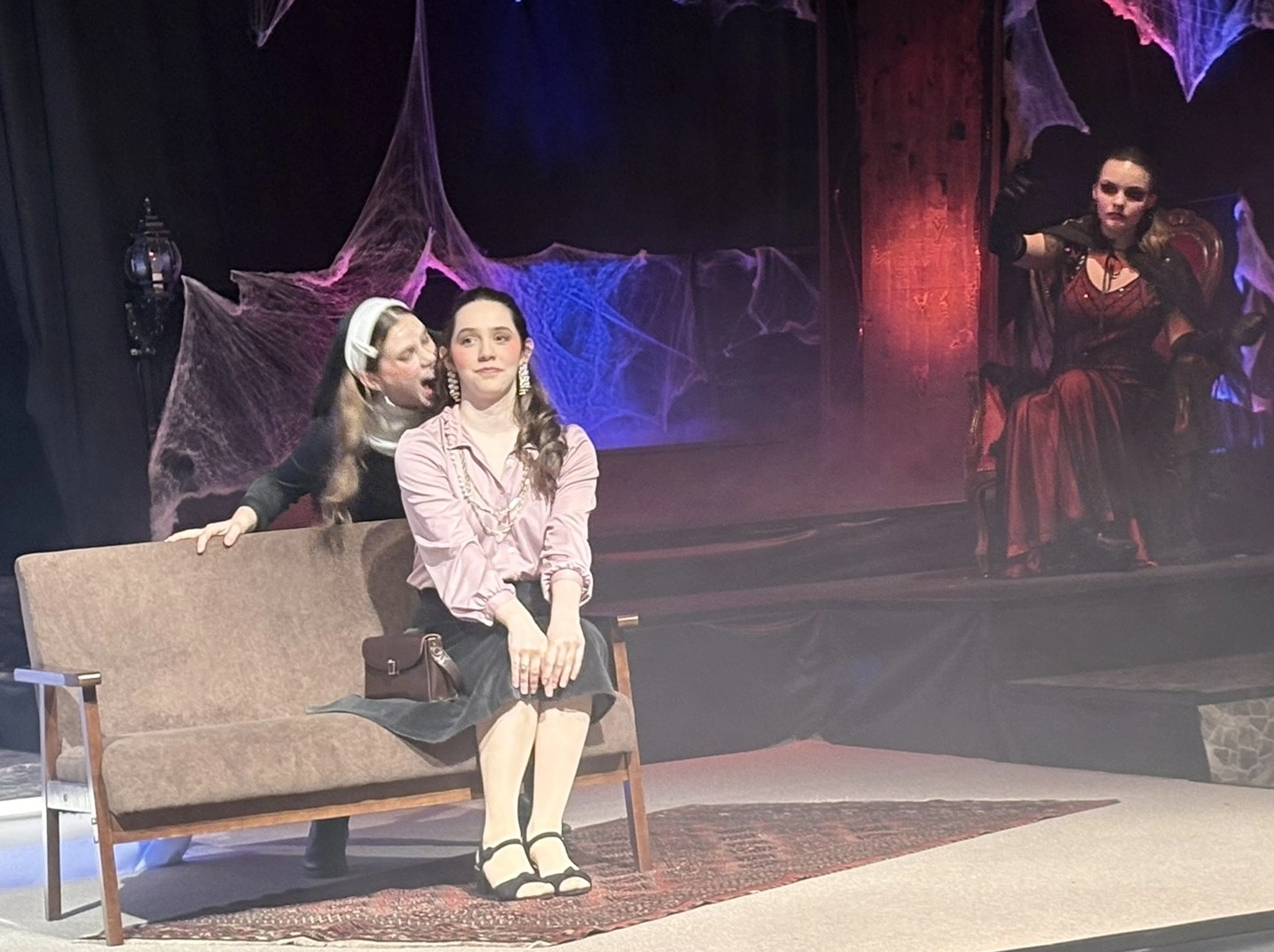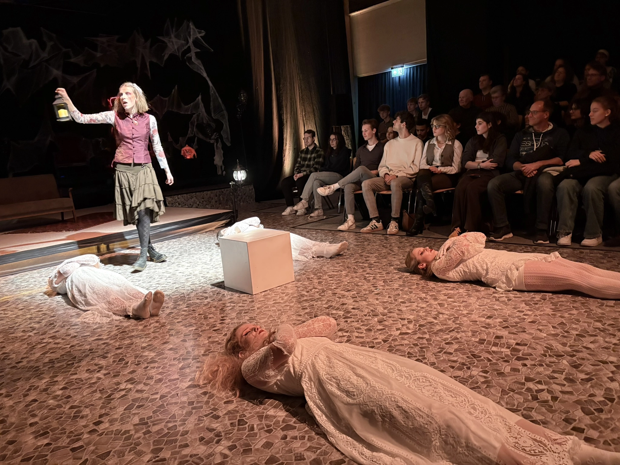 Die „Bübis“ (unsere Bühnenbild-AG) sowie zahlreiche Helferinnen und Helfer haben beeindruckende Arbeit geleistet. Schon vor Beginn des Stücks zog das Bühnenbild die Aufmerksamkeit des Publikums auf sich: Draculas Schloss erscheint in düsteren Rot- und Schwarztönen, während die grell ausgeleuchtete Nervenanstalt in Neonröhren erstrahlt – ein eindrucksvoller Kontrast zwischen Fantasie und klinischer Realität. Auch Kostüme und Maske überzeugen, gestaltet von Lena Till und Sude Kablan, ehemaligen Schülerinnen, die dem Schultheater weiterhin verbunden sind. Die Tanzeinlagen wurden ebenfalls von einer ehemaligen Schülerin, Carolin Gehring, einstudiert – ein schönes Beispiel für „einmal Schultheater – immer Schultheater“.