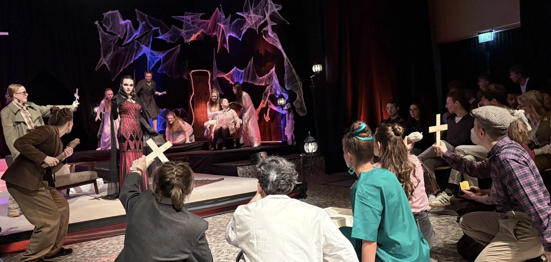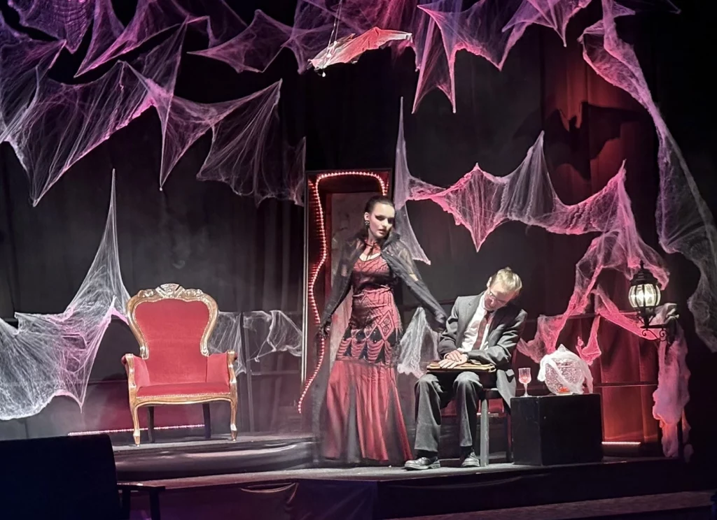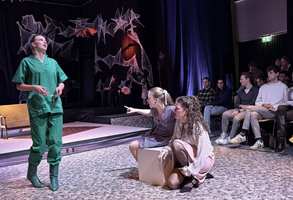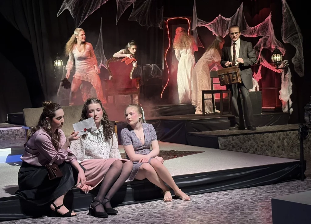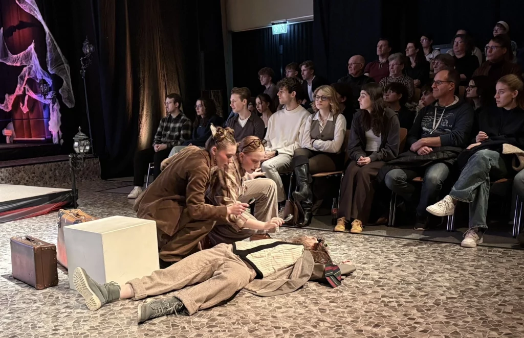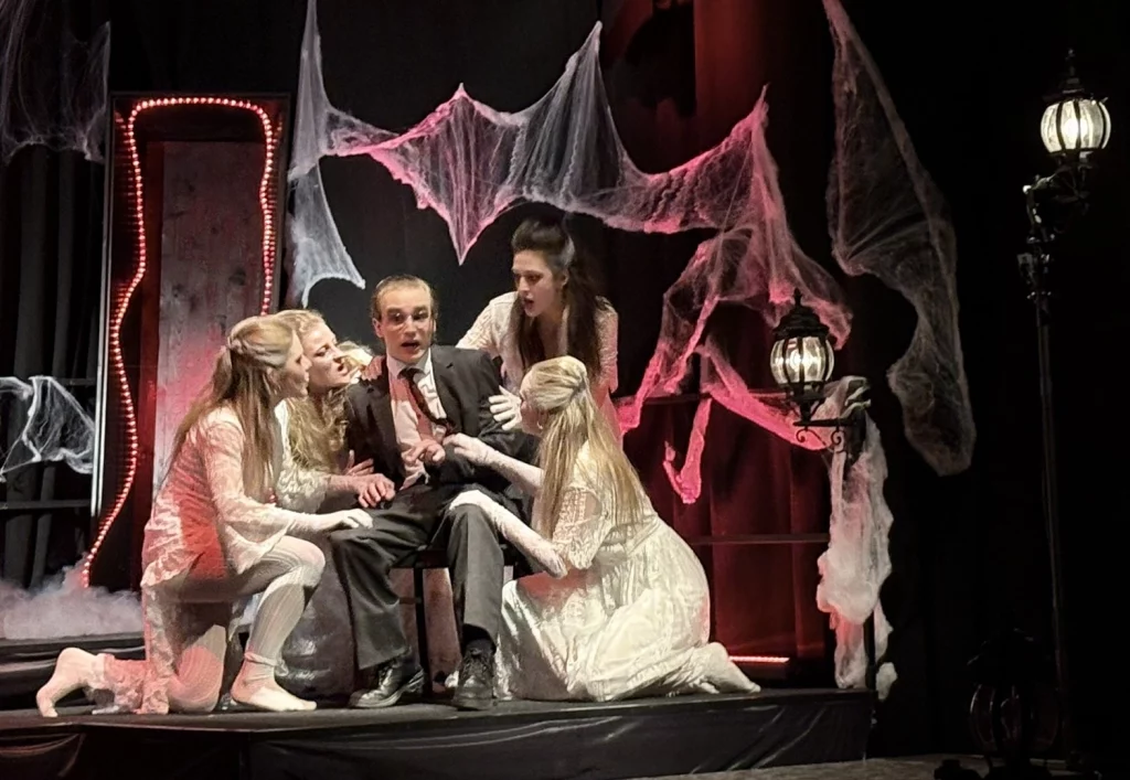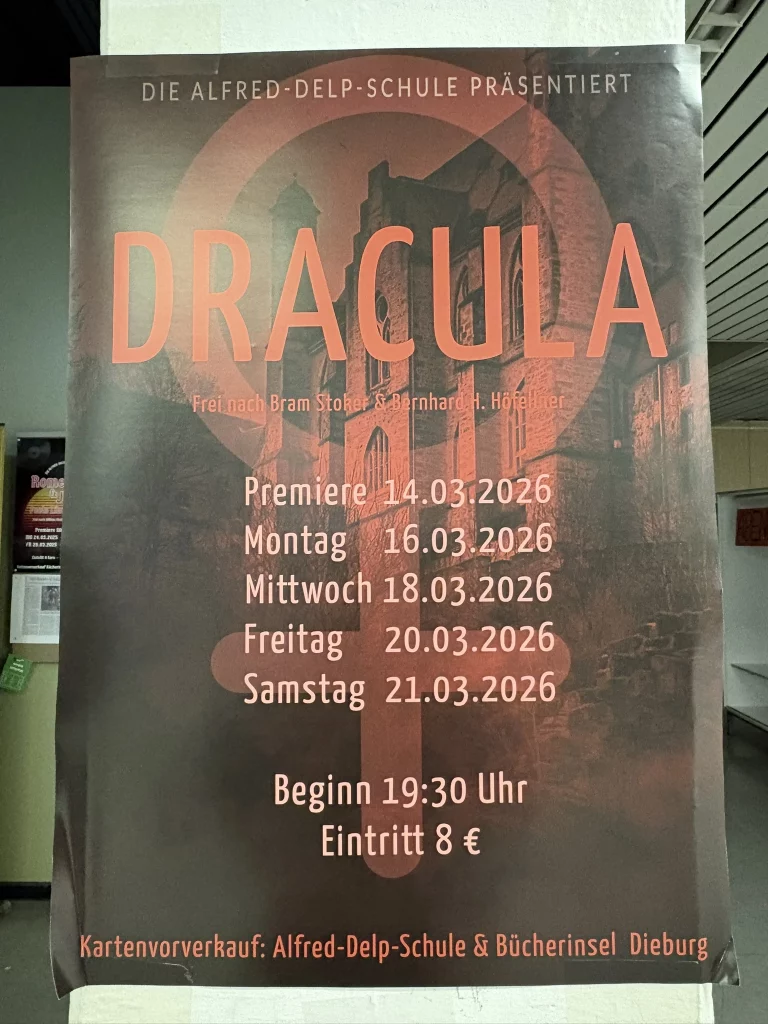Mit viel Kreativität, großer Spielfreude und beeindruckendem Engagement feierte das Schultheater unserer Schule eine gelungene Premiere. In diesem Jahr brachte die Theatergruppe eine eigene Interpretation des Vampirklassikers Dracula auf die Bühne und schuf dabei eine ebenso düstere wie atmosphärisch dichte Inszenierung. Schauspiel, Bühnenbau und Technik griffen eindrucksvoll ineinander und ließen eine Welt entstehen, die das Publikum vom ersten Moment an in ihren Bann zog. Nach den zuletzt erfolgreichen Inszenierungen von Romeo and Julia und Alice im Wunderland wagten sich die Schülerinnen und Schüler damit an ein deutlich düstereres Stück – basierend auf der Vorlage von Bram Stoker und der Bühnenfassung von Bernhard H. Höfellner.