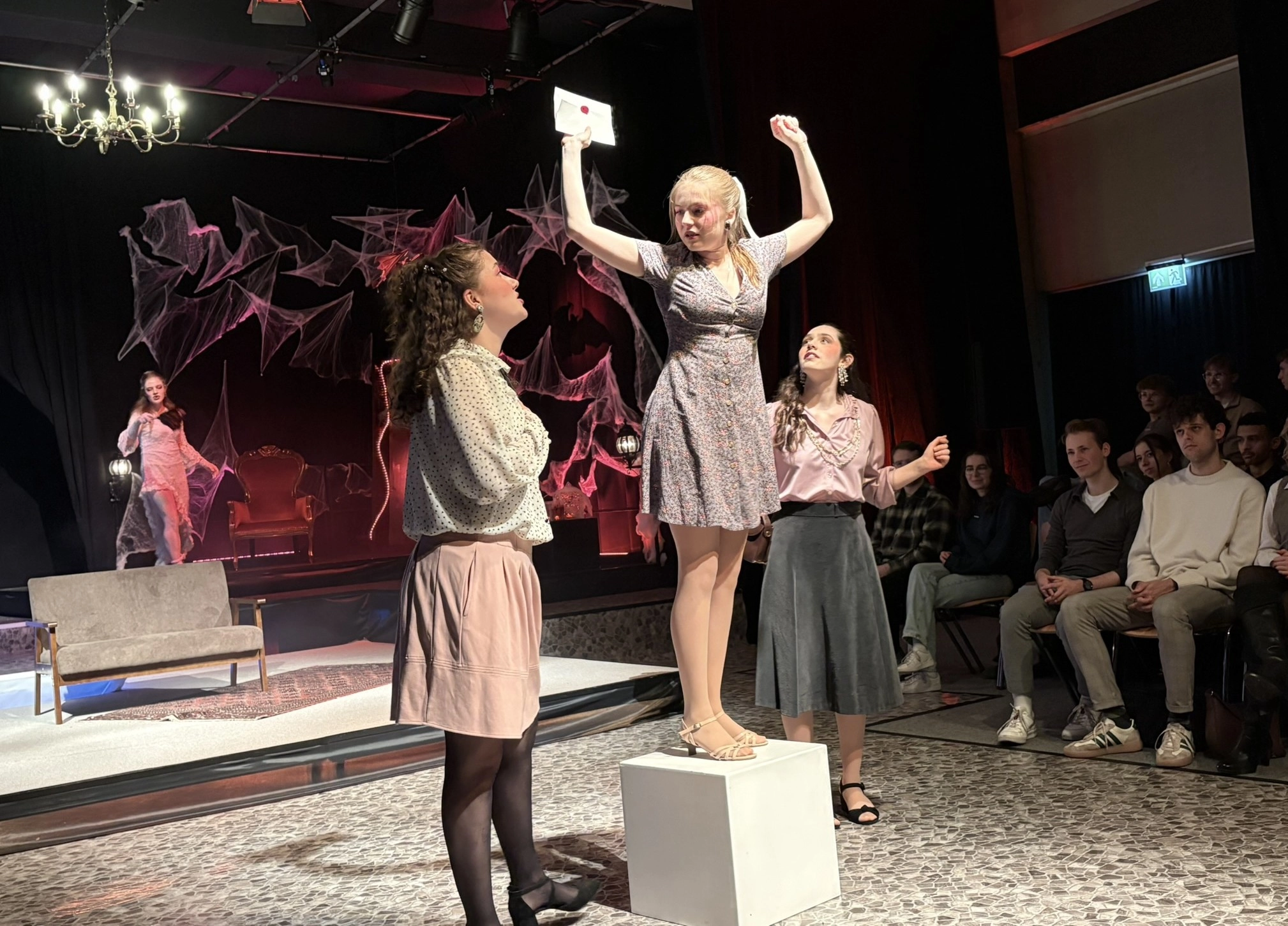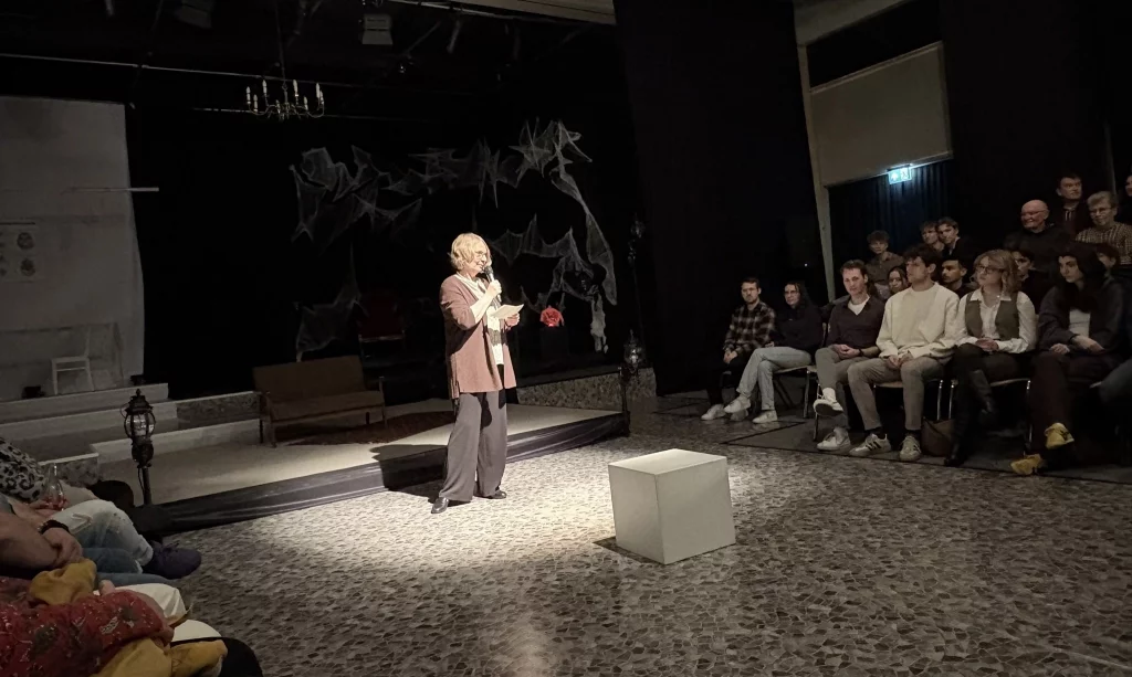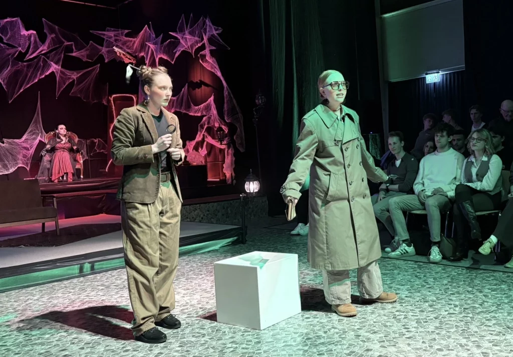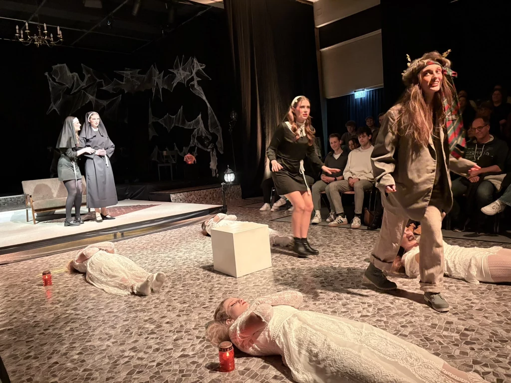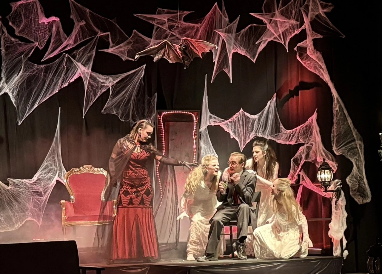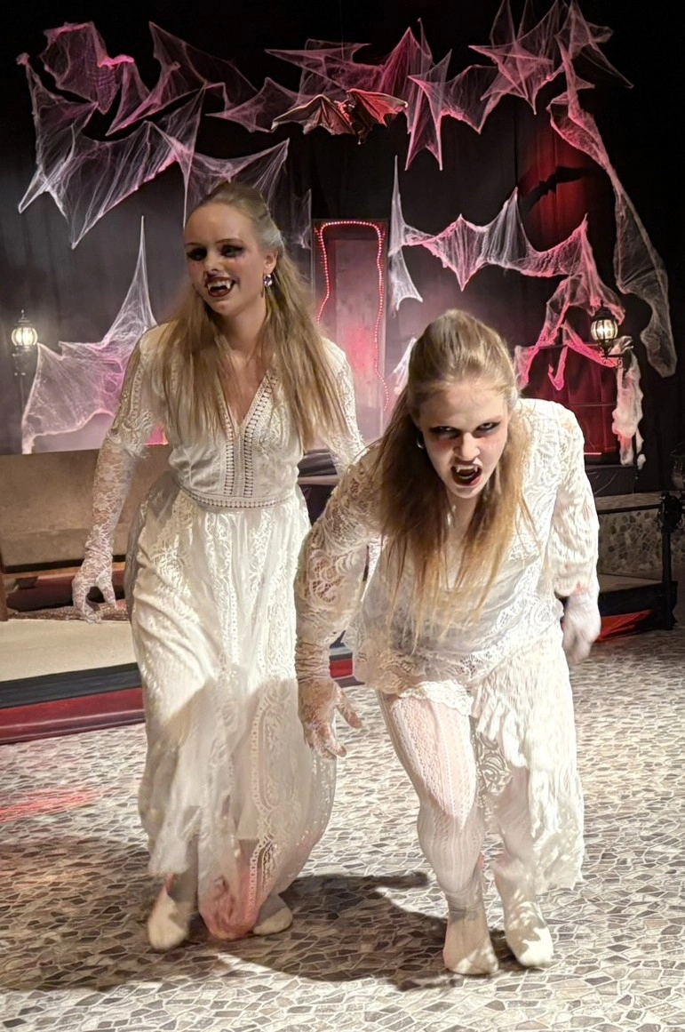 Mit viel Kreativität, großer Spielfreude und beeindruckendem Engagement feierte das Schultheater unserer Schule eine gelungene Premiere. In diesem Jahr brachte die Theatergruppe eine eigene Interpretation des Vampirklassikers Dracula auf die Bühne und schuf dabei eine ebenso düstere wie atmosphärisch dichte Inszenierung. Schauspiel, Bühnenbau und Technik griffen eindrucksvoll ineinander und ließen eine Welt entstehen, die das Publikum vom ersten Moment an in ihren Bann zog. Nach den zuletzt erfolgreichen Inszenierungen von Romeo and Julia und Alice im Wunderland wagten sich die Schülerinnen und Schüler damit an ein deutlich düstereres Stück – basierend auf der Vorlage von Bram Stoker und der Bühnenfassung von Bernhard H. Höfellner.